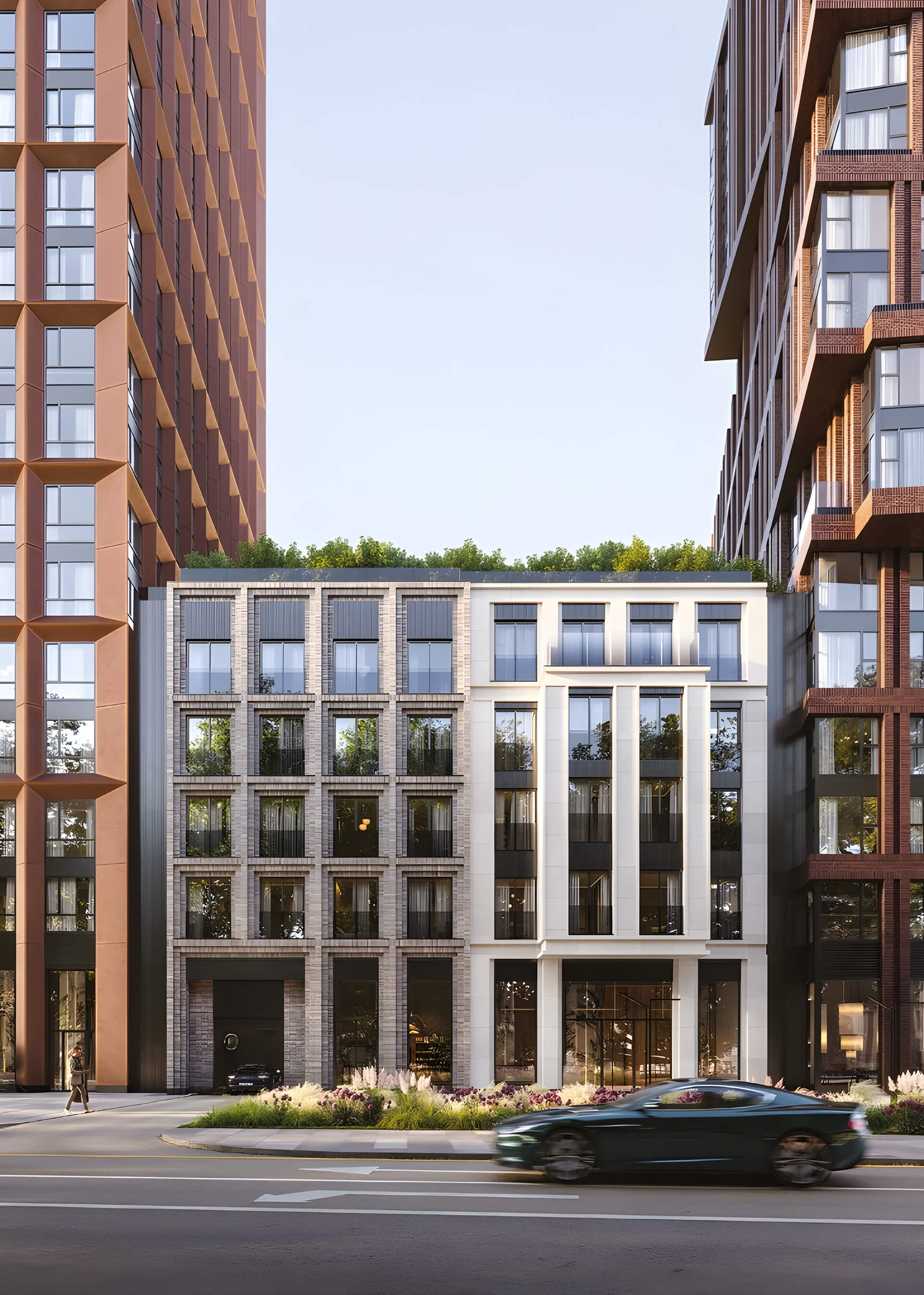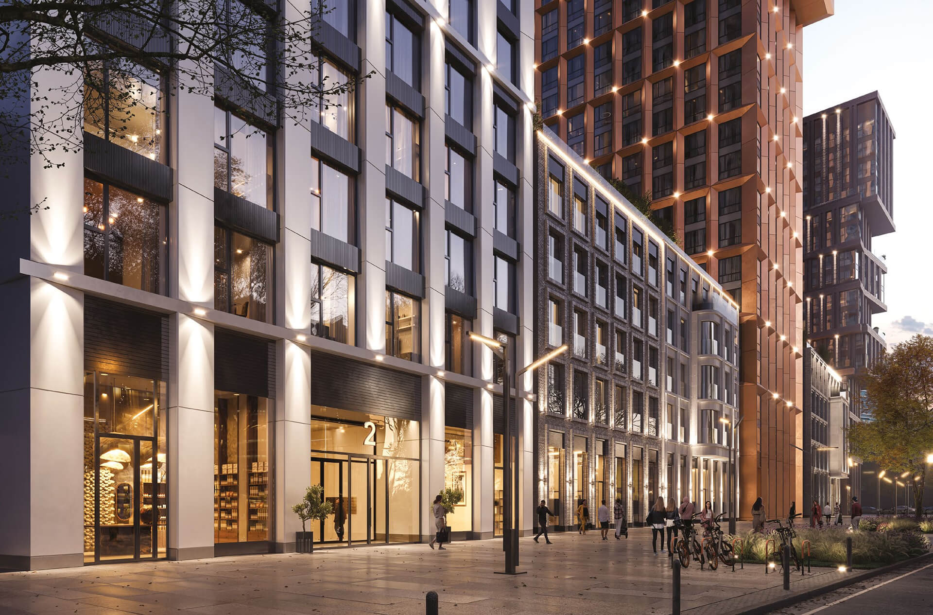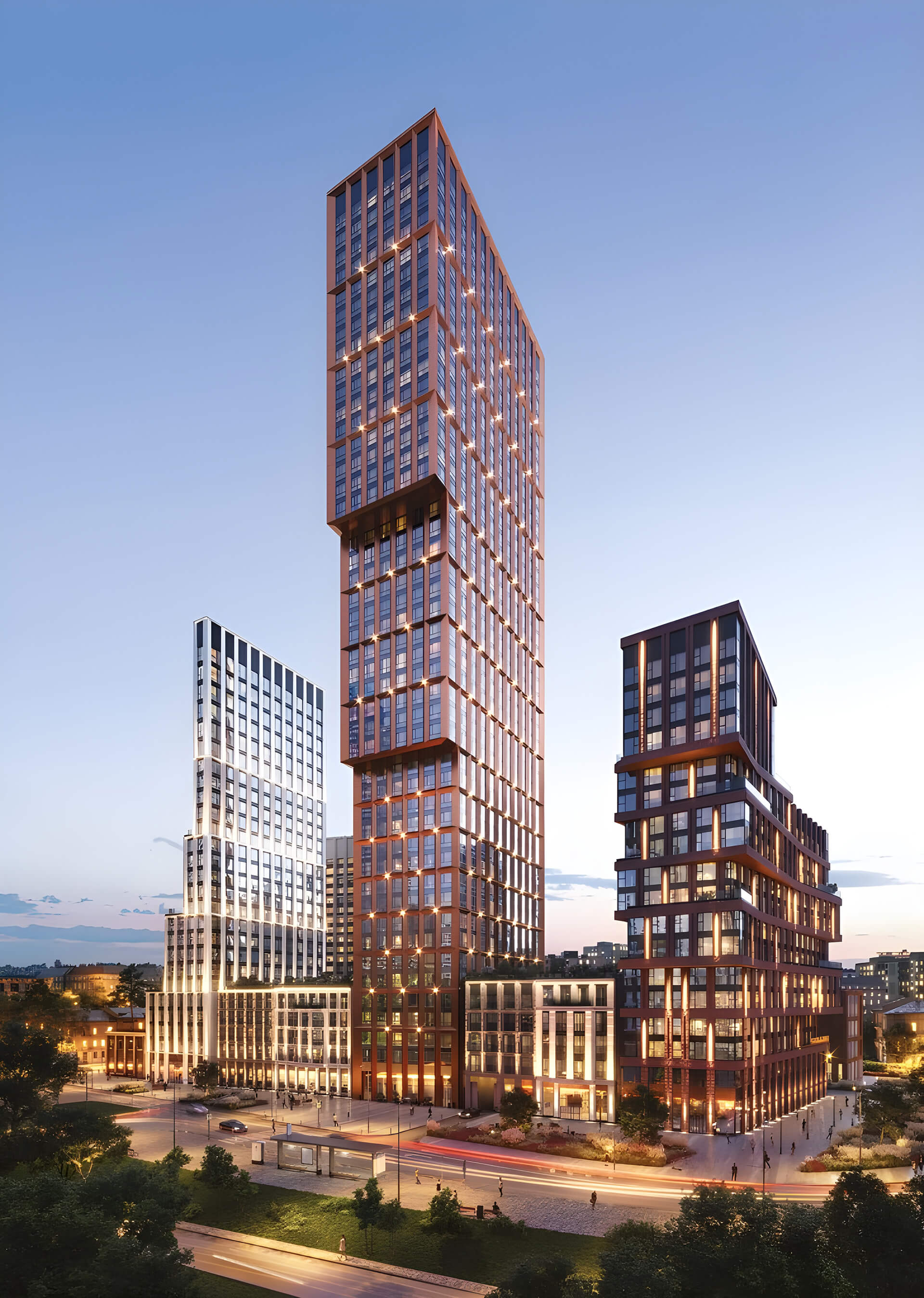 Особое внимание уделено вечерней архитектурной подсветке, которая мягко обрамляет геометрию фасадов и подчёркивает силуэт башен на фоне городского неба. Освещение создаёт выразительную атмосферу, делая комплекс яркой точкой притяжения в районе. Архитектура «Ракурса» — это не просто облик зданий, а тщательно продуманная эстетическая система, в которой каждый элемент имеет смысл и создает характер проекта.