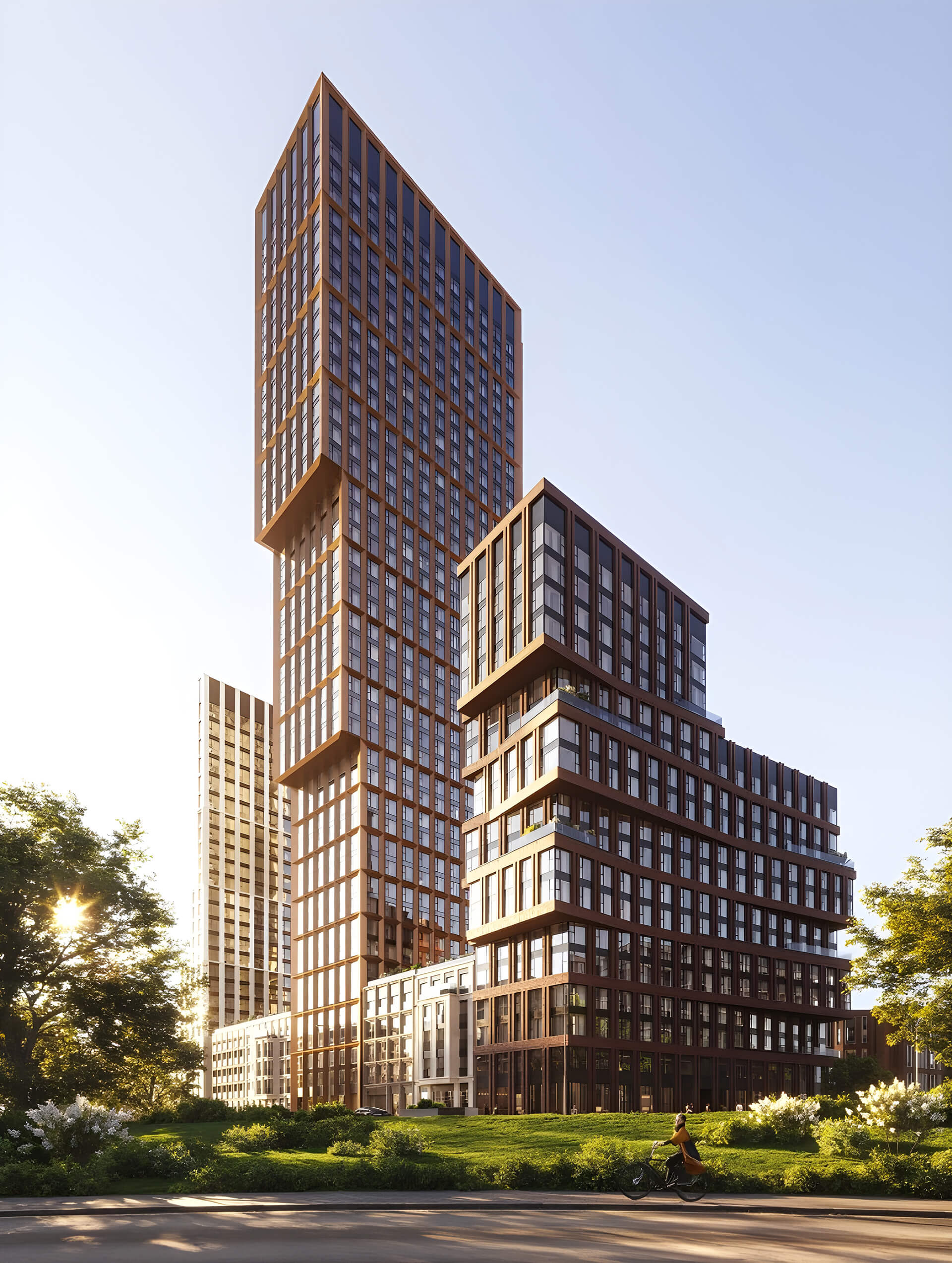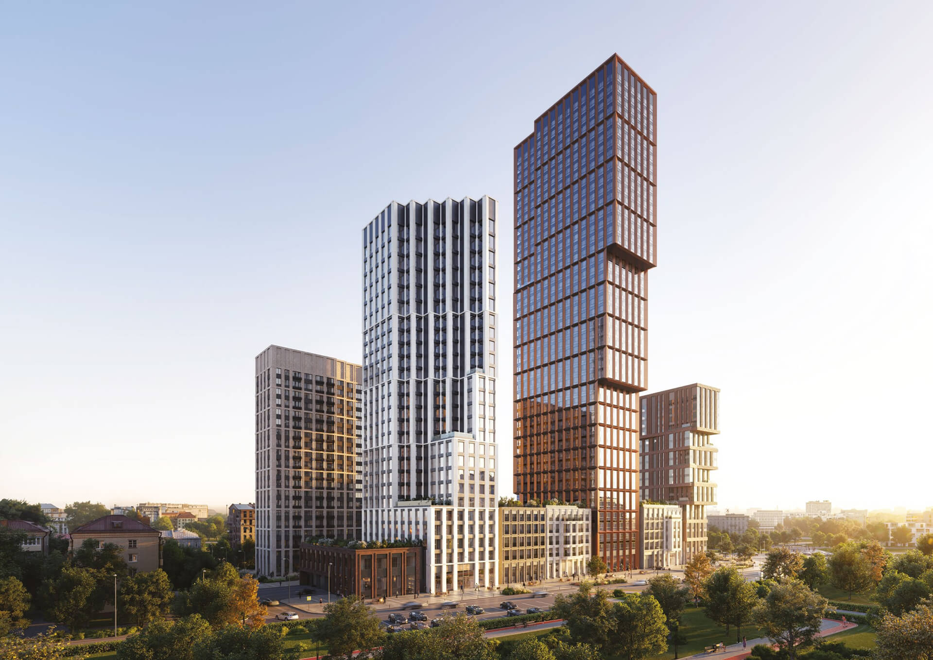 Архитектурная концепция жилого комплекса разработана одним из ведущих российских архитектурных бюро, что заметно в каждом элементе облика зданий. Три башни комплекса создают динамичную композицию, визуально напоминающую стопку книг, которая стала ключевой идеей проекта. Такая архитектура не только выделяет комплекс среди застройки, но и формирует уникальный силуэт, в котором сочетаются вертикальный ритм, выразительные линии и строгая геометрия. Фасады выполнены из качественных материалов, что обеспечивает долговечность и эстетическую выразительность.